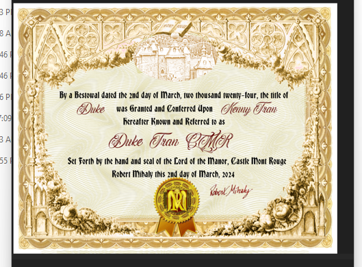 On March 2nd of 2024, Robert Mihaly awarded Kenny Tran the title of Duke of Castle Mont Rouge.